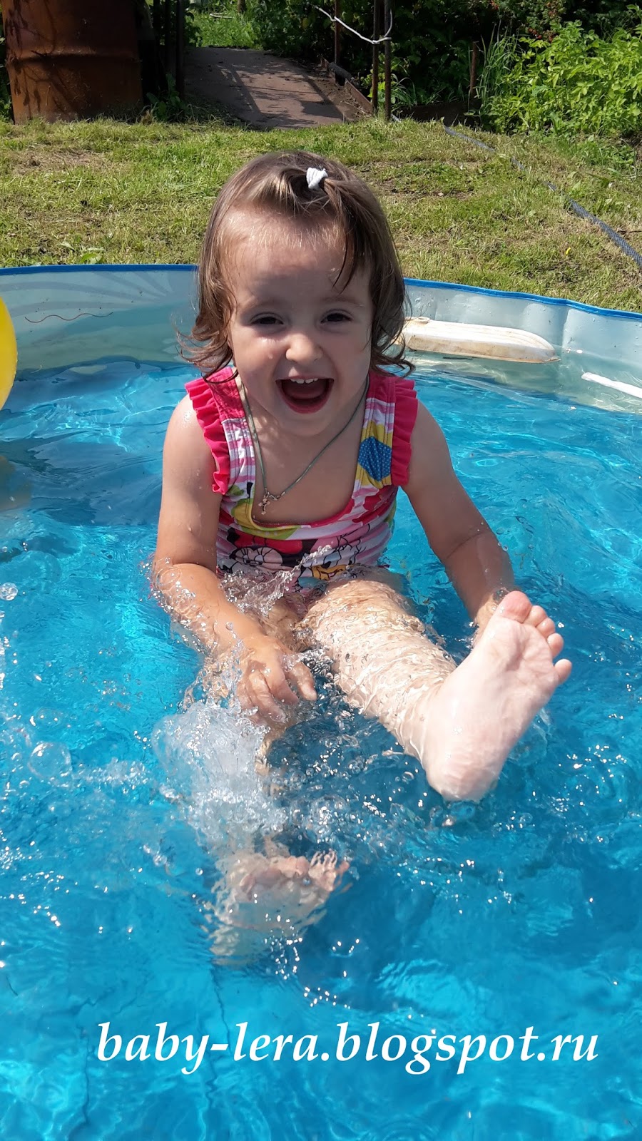 Доча этим летом частенько бывала на даче у бабушки с дедушкой. Иногда даже без мамы. А т.к. всем окружающим её взрослым необходимо было заниматься посадкой/прополкой/уборкой и т.д., то встал закономерный вопрос: как следить за нашей непоседой и не отвлекаться от дела? Выходом стал детский бассейн.